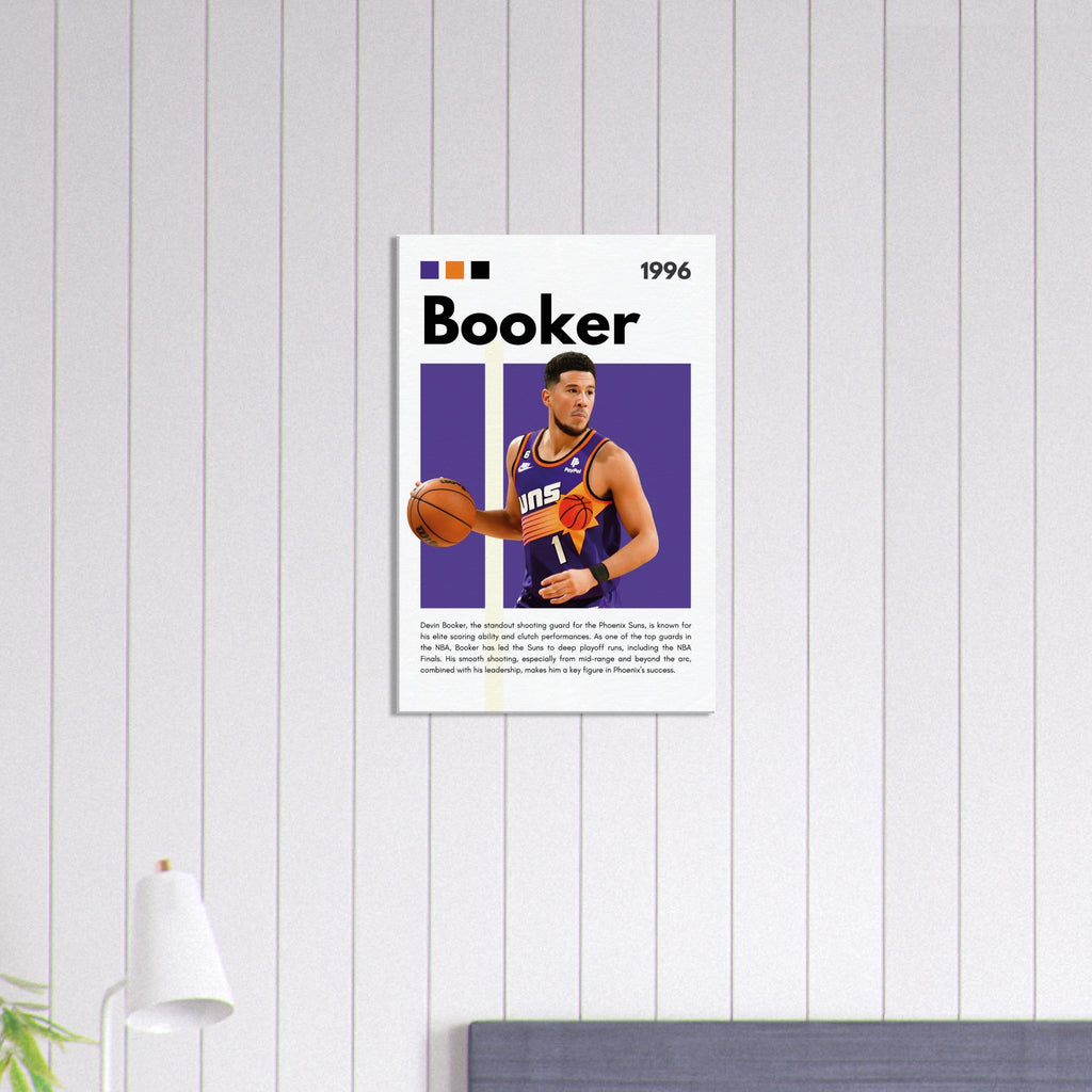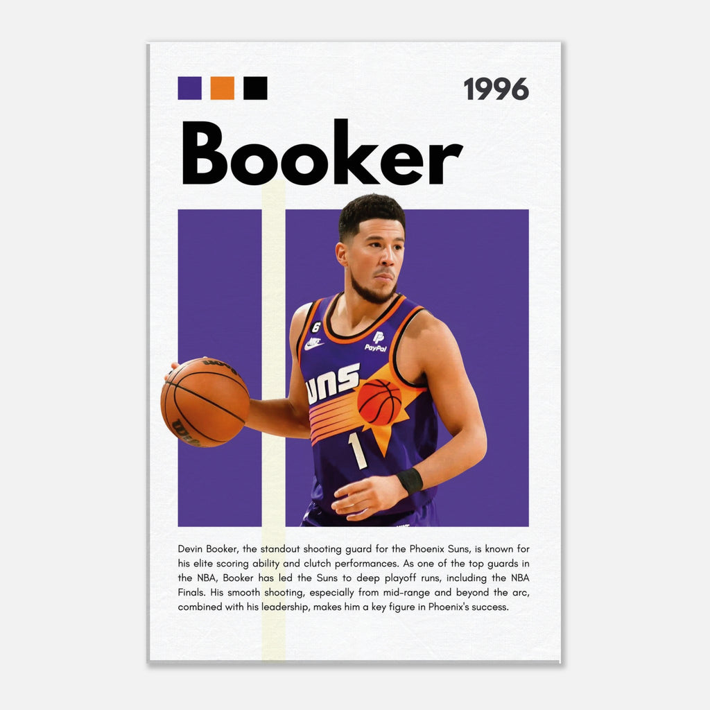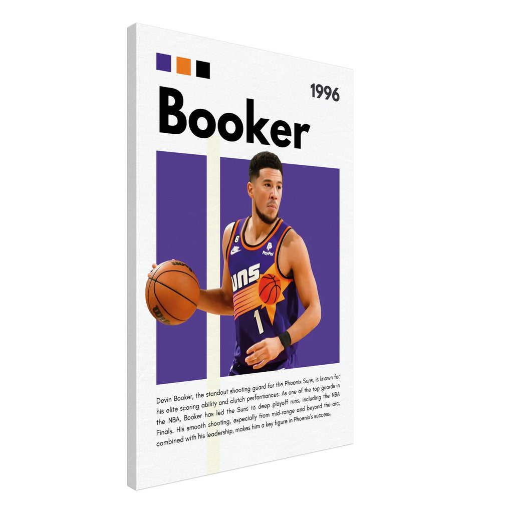 Capture the essence of NBA greatness with this dynamic Devin Booker wall art, featuring the Phoenix Suns star in his iconic jersey. Designed with the team's vibrant purple and orange, this premium canvas print brings the energy of the court directly into your home, office, or fan space. It’s the perfect tribute for any dedicated basketball enthusiast or art lover looking to celebrate one of the game's most exciting players.