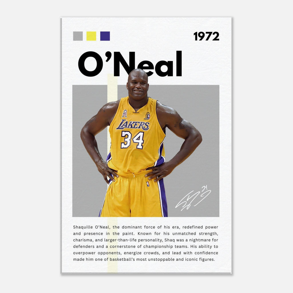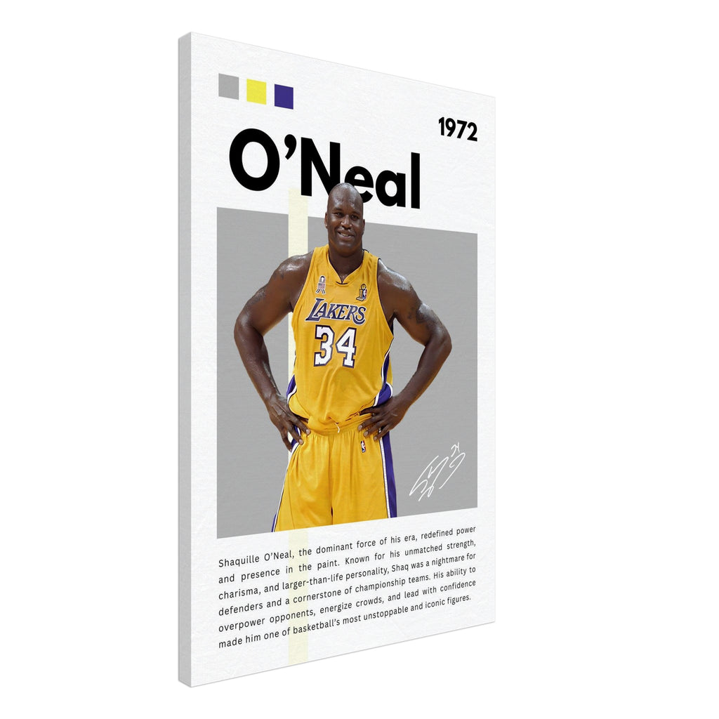 Celebrate one of basketball's greatest icons with this stunning Shaquille O'Neal wall art, featuring him in his classic Lakers kit with his iconic number 34. Designed with bold gold and purple colors and dynamic detail, this tribute canvas adds energy and inspiration to any room — the perfect centerpiece for true Shaq fans and sports lovers alike.