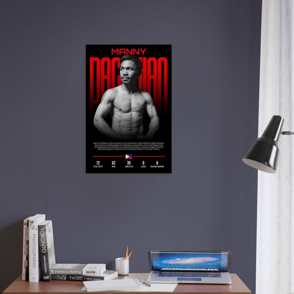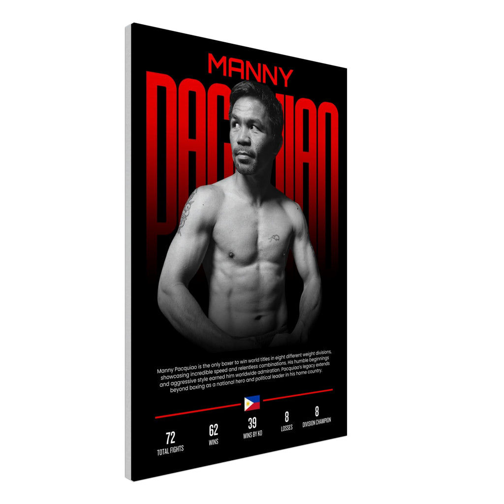 Celebrate the unparalleled legacy of Manny Pacquiao, the only boxer to win world titles in eight different weight divisions, with this stunning wall art. This dynamic piece, rendered in bold black, white, and powerful red, captures the essence of his incredible speed, relentless combinations, and aggressive style that earned him worldwide admiration. It's the perfect centerpiece for true boxing fans and sports enthusiasts, adding energy and inspiration to any room.