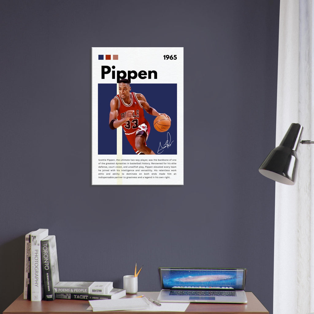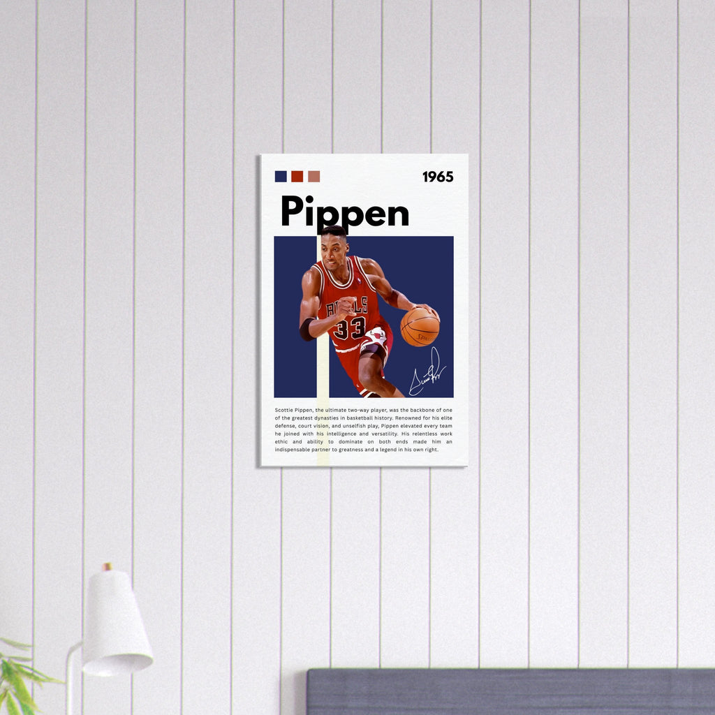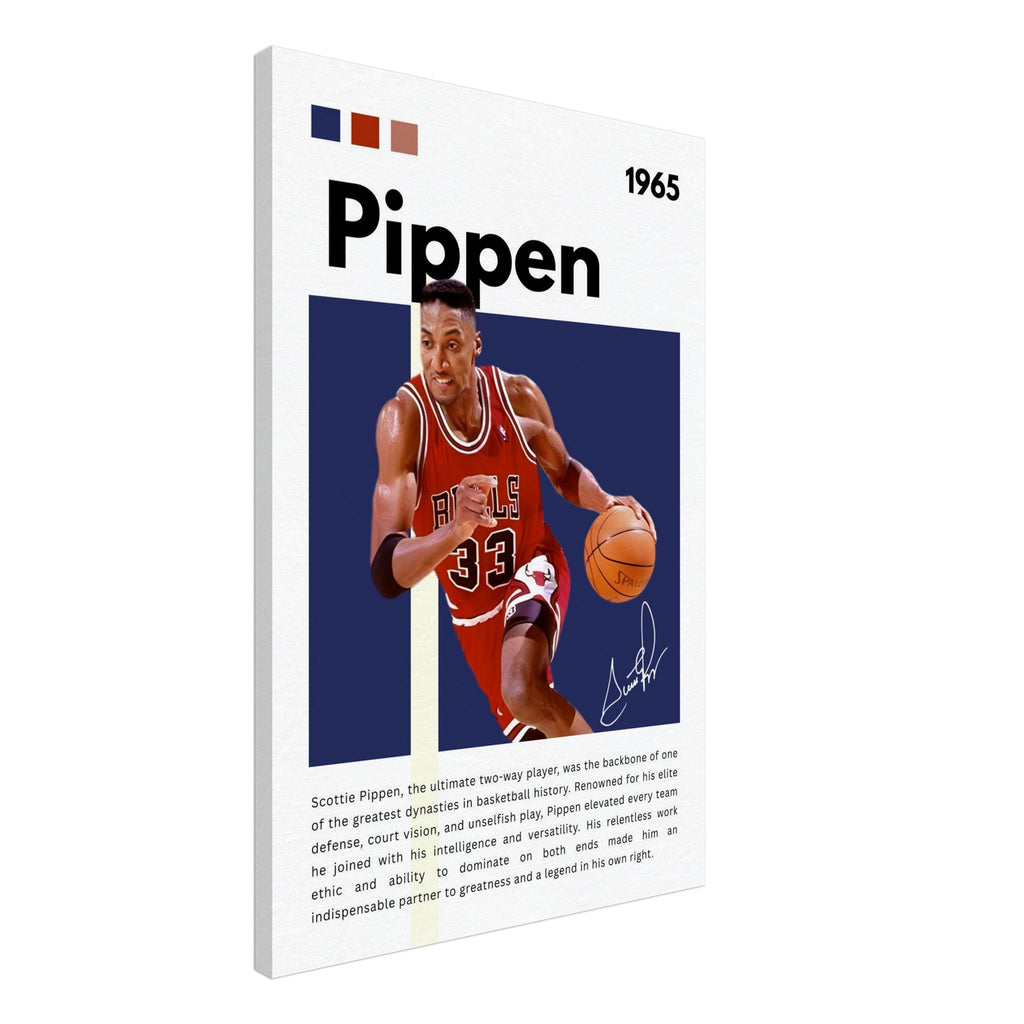 Immortalize a basketball legend with this striking Scottie Pippen wall art, showcasing him in his iconic Chicago Bulls number 33 jersey. With bold colors and dynamic energy, this tribute canvas perfectly captures Pippen's intensity and skill, making it an essential piece for any true basketball enthusiast or Bulls fan looking to add a touch of greatness to their space.