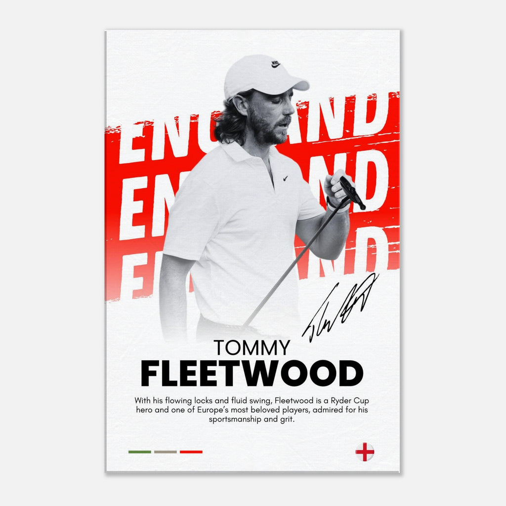 Capture the essence of a true golf icon with this striking Tommy Fleetwood wall art. Featuring the beloved Ryder Cup hero set against a vibrant 'England' backdrop, this canvas embodies his sportsman-like grit and legendary status. The bold red and white palette, coupled with dynamic artistic flair, makes this piece a powerful statement for any fan or sports enthusiast.