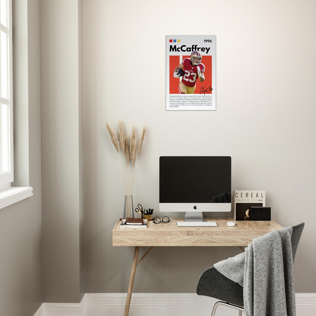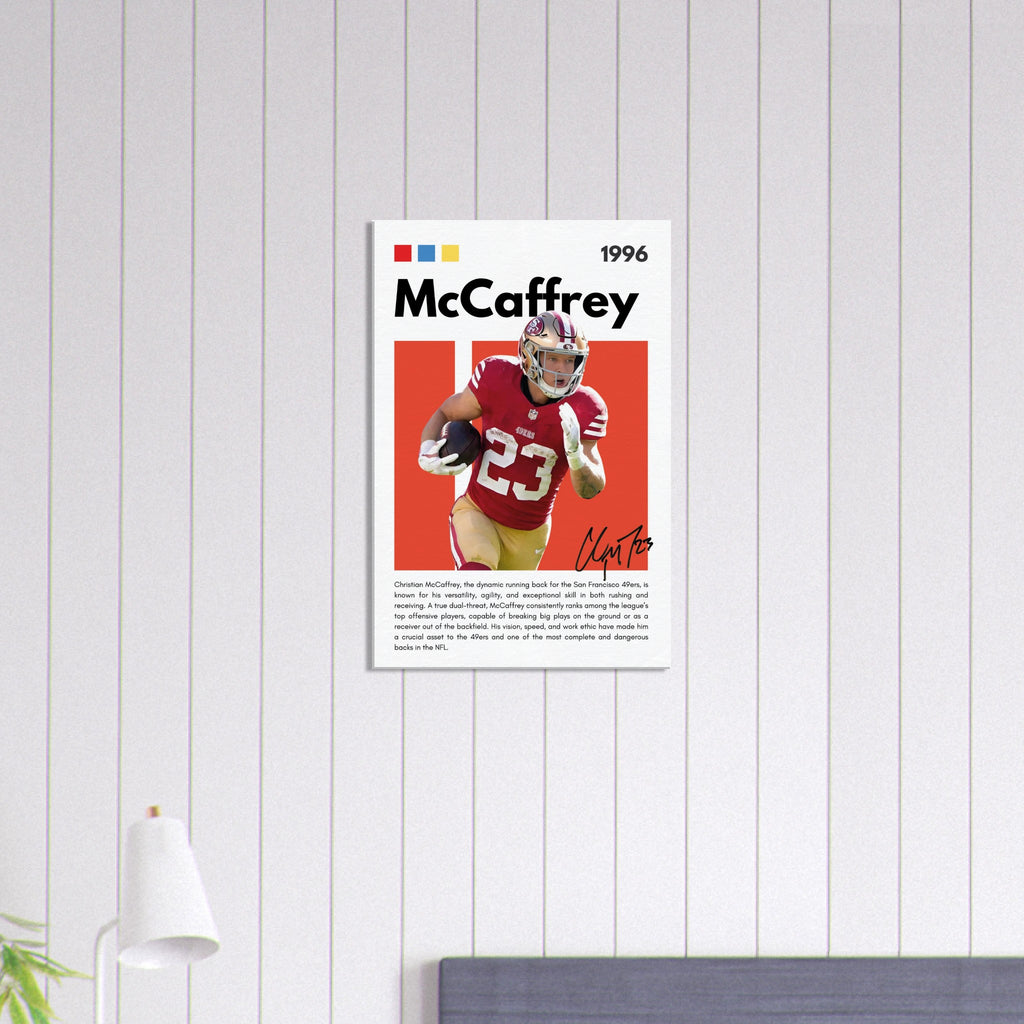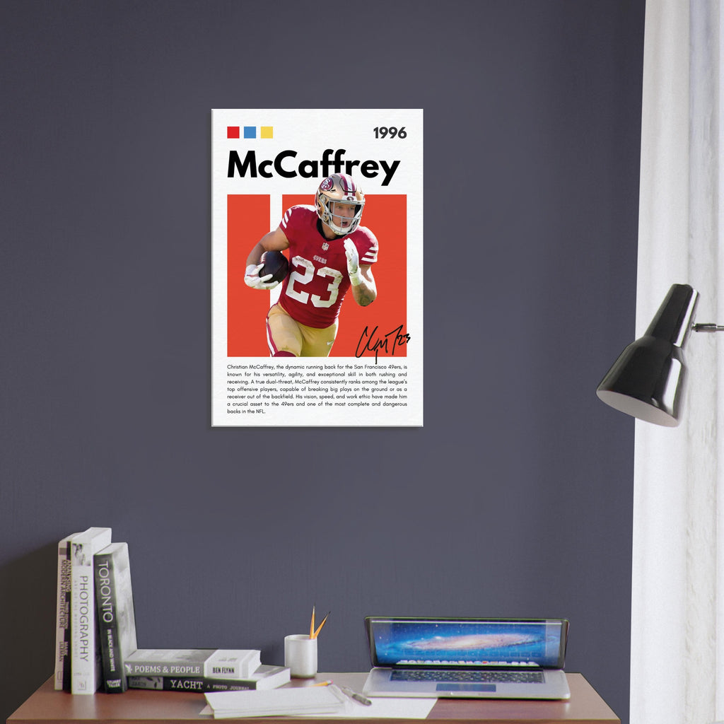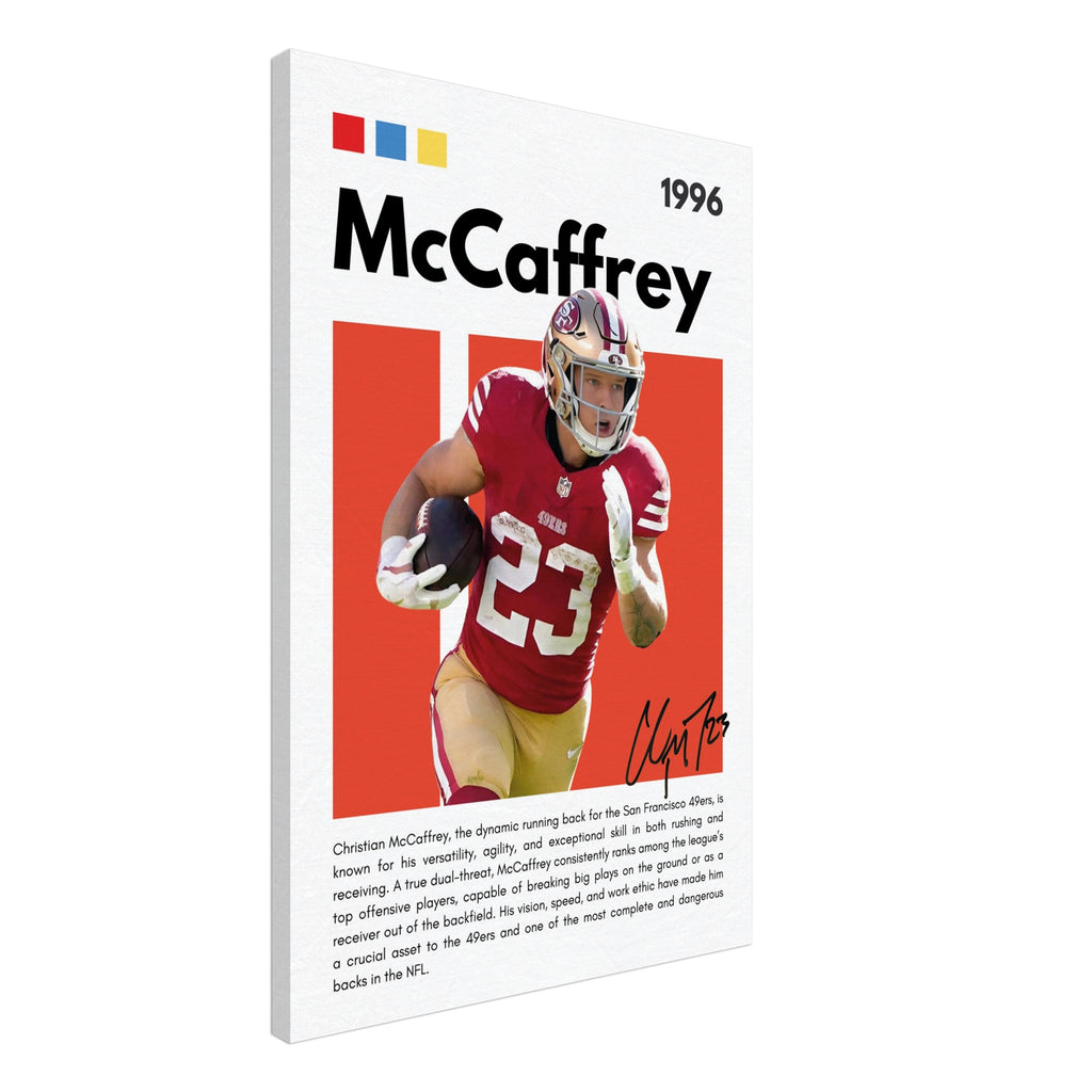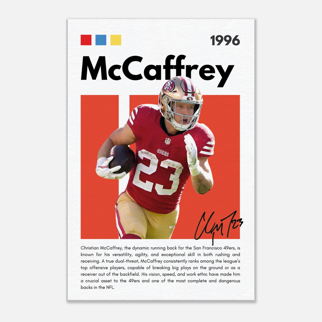 Celebrate the electrifying talent of Christian McCaffrey with this dynamic wall art, capturing him in his iconic San Francisco 49ers kit. Set against a vibrant red backdrop, this piece embodies the energy and skill that makes McCaffrey a force on the field, complete with a facsimile signature print. It’s the perfect statement piece for any football enthusiast or a passionate 49ers fan looking to add a touch of gridiron greatness to their space.