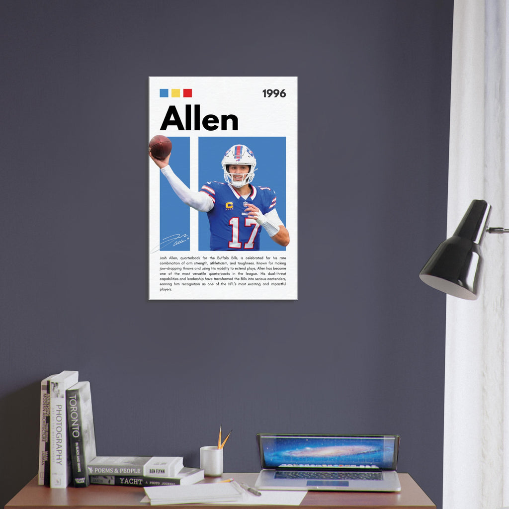 Elevate your fan cave with this dynamic Josh Allen wall art, celebrating the Buffalo Bills' powerhouse quarterback. Featuring Allen in his iconic uniform with his signature print, this vibrant canvas captures the energy and passion he brings to the game. It's the ultimate tribute for any Bills fan or sports enthusiast, bringing a touch of gridiron glory and inspiration to any space.