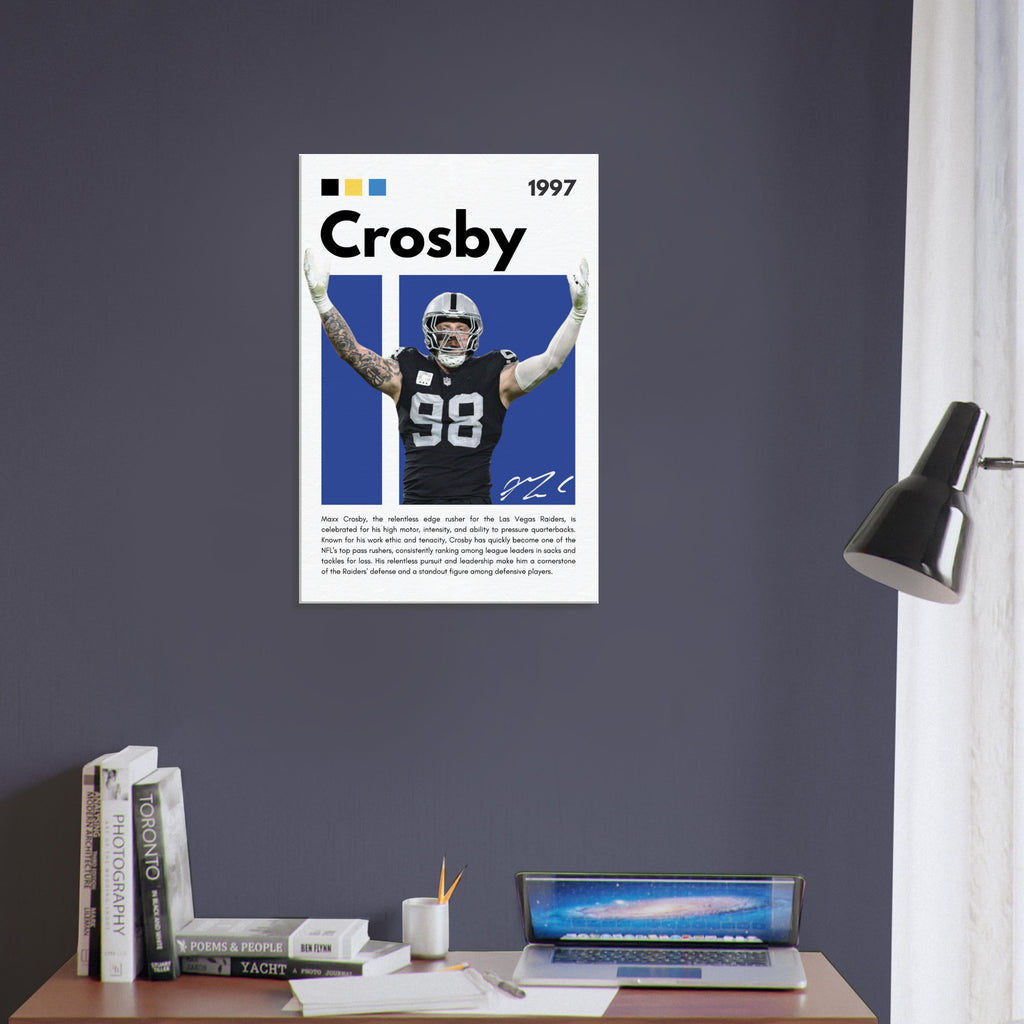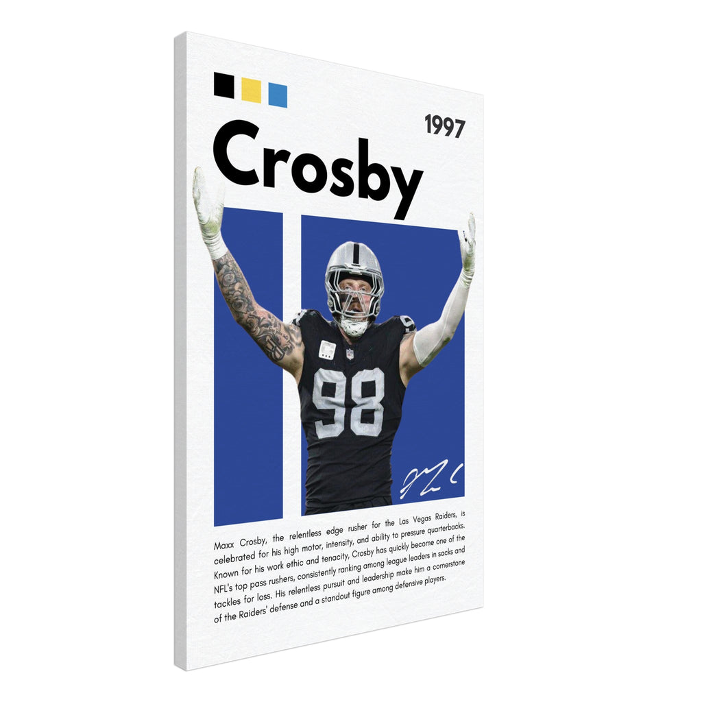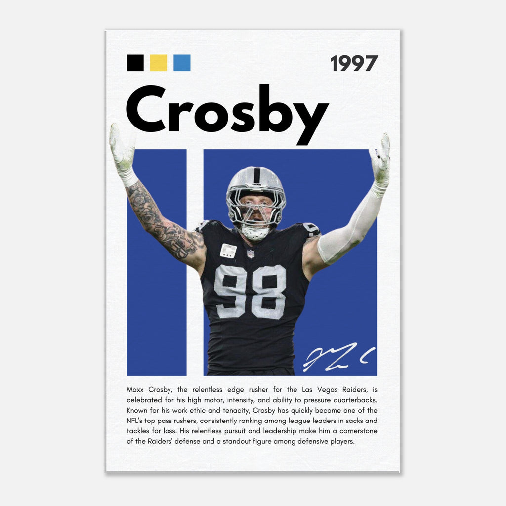 Celebrate one of football’s most relentless forces with this stunning Maxx Crosby wall art, featuring him in his iconic Las Vegas Raiders kit with his powerful number 98. Designed with bold colors and dynamic detail against a striking blue background, this tribute canvas adds energy and inspiration to any room — the perfect centerpiece for true Raiders fans and sports lovers alike.