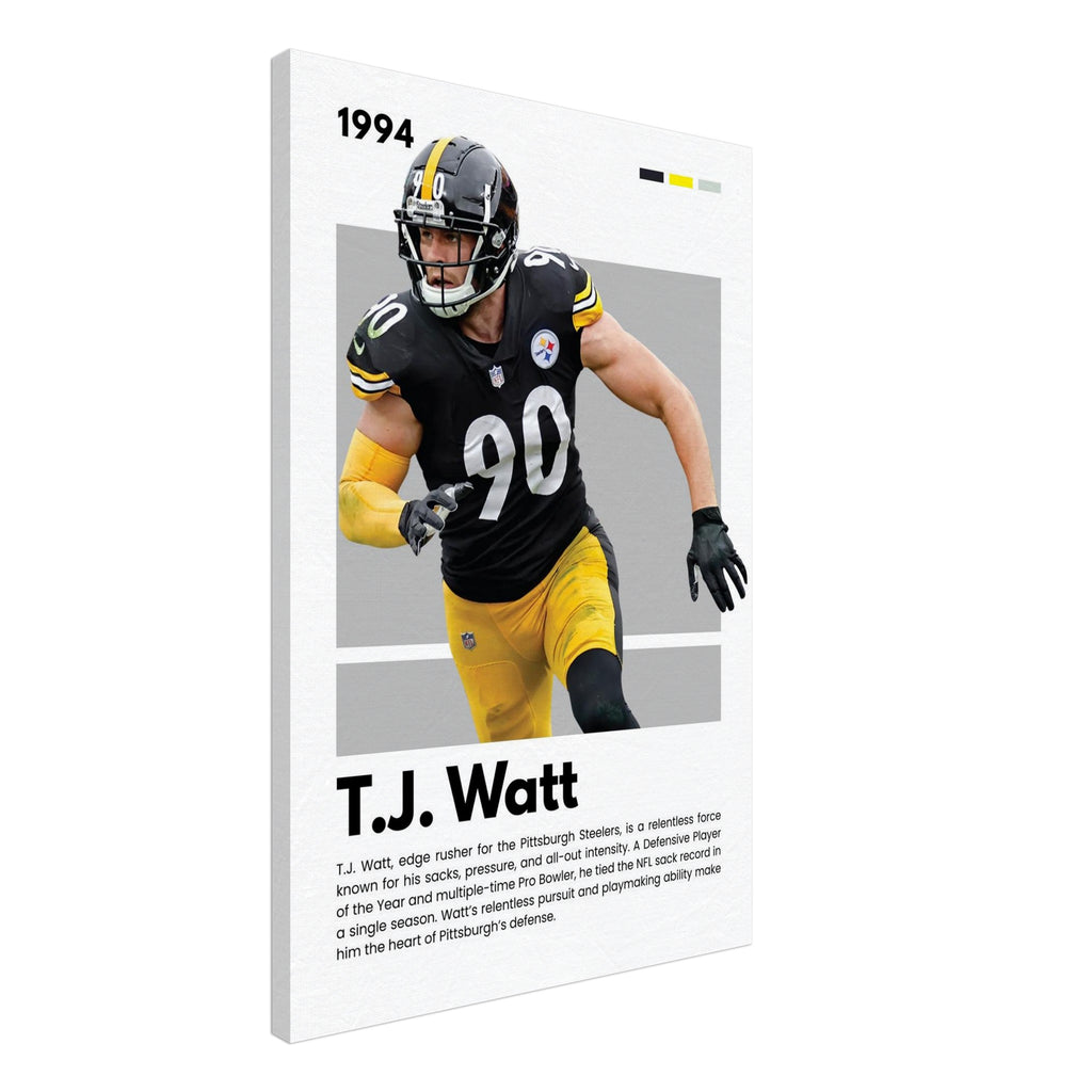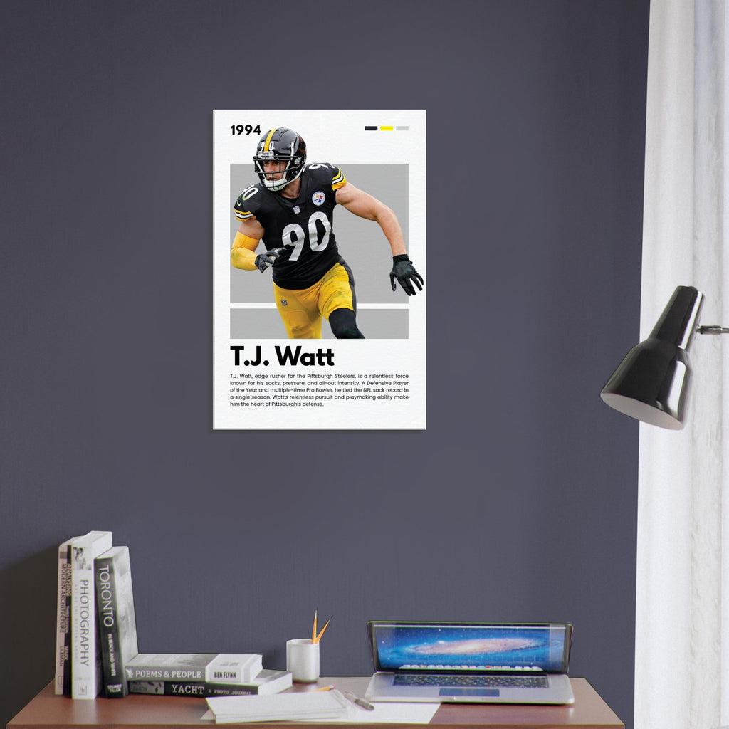 Unleash the power of the gridiron with this striking T.J. Watt wall art, featuring the formidable Pittsburgh Steelers star in his iconic black and gold #90 jersey. Designed with dynamic energy and bold detail, this canvas print captures the relentless spirit and intensity of one of football's premier defensive players. It's an electrifying centerpiece that brings the roar of the stadium into any room, perfect for true Steelers fans and sports enthusiasts who appreciate game-changing talent.