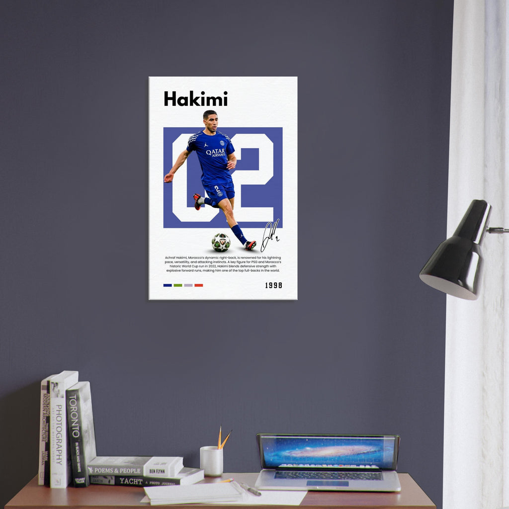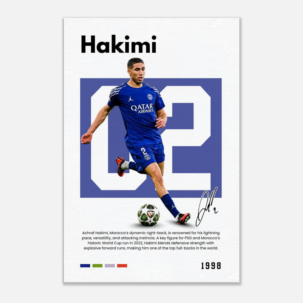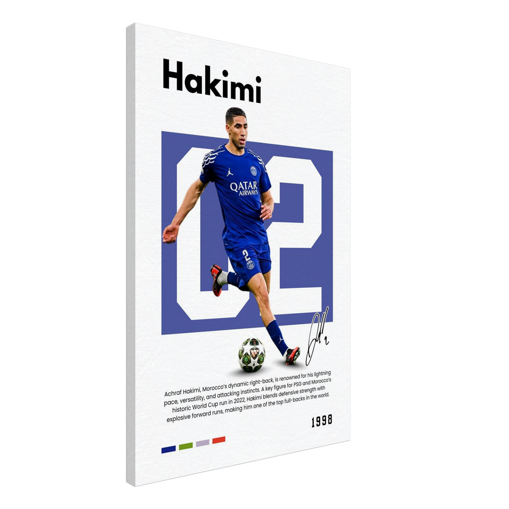 Unleash the spirit of the game with this electrifying Achraf Hakimi wall art! Featuring the dynamic Moroccan right-back in his iconic PSG kit, this canvas captures his incredible pace and attacking prowess. With bold graphics and an exquisite facsimile signature, this piece is a powerful tribute to one of football's most exciting talents. Elevate your space with the energy and inspiration of Hakimi’s relentless drive and defensive strength.
