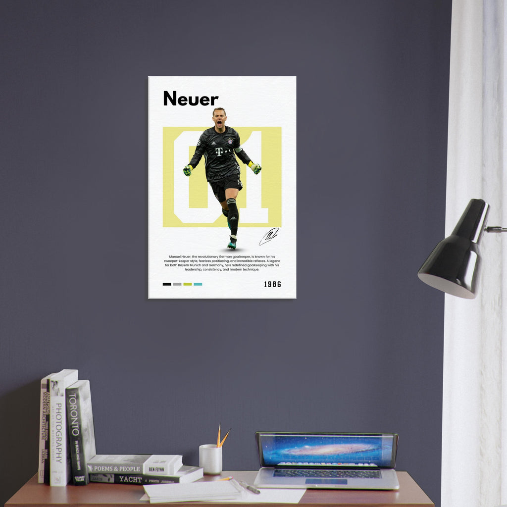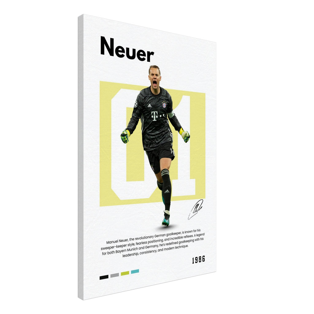 Experience the intensity and brilliance of Manuel Neuer with this striking wall art. Featuring the legendary goalkeeper in his iconic kit, poised for action, this canvas captures the fierce determination and revolutionary style that defines his game. The bold graphic design and vibrant accents make it a powerful statement piece, bringing the spirit of world-class football into your home, office, or fan zone. Perfect for those who admire Neuer's unparalleled skill and leadership, it’s a constant reminder of greatness.