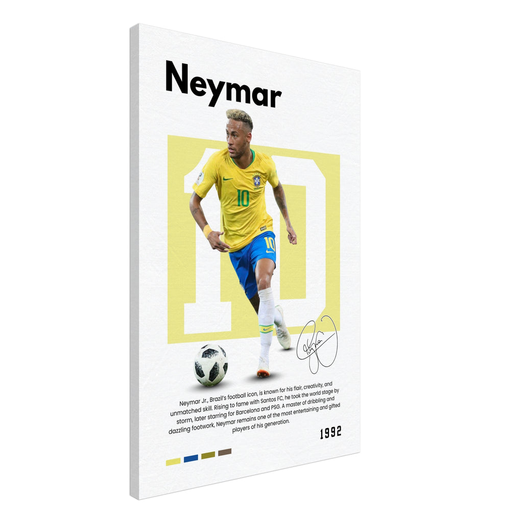 Immerse yourself in the electrifying energy of Neymar Jr. with this vibrant wall art, capturing him in his iconic Brazil kit. This captivating canvas, featuring bold colors and an exquisite facsimile signature print, perfectly encapsulates Neymar's flair, creativity, and unmatched skill. It’s a dynamic tribute designed to inspire and energize any space, making it an essential acquisition for dedicated Neymar fans and football enthusiasts.